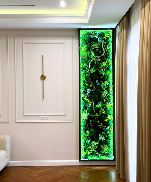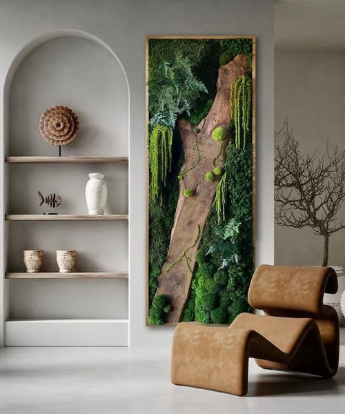 Fitostena - это современный стиль дизайна, в котором для сохранения многомерного искусства, используются сохранившиеся произведения природы, такие как мхи, растения и дерево.